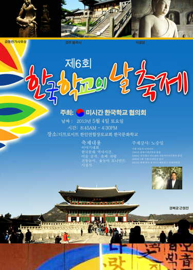 미시간 협의회에서는 오는 5월4일 (토) 디토로이트 한인연합장로교회에서 제6회 한국학교의 날 축제를 갖습니다. 이 날 행사에는 이야기 대회를 비롯하여 한국문화역사 시간, 미술공작, 솜씨 자랑 등 다채로운 순서가 있습니다. 특히, 금년에는 GM 자동차의 노승일 자동차 디자이너를 주제 강사로 모셨습니다. 자동차 디자인에 대한 그의 소신과 경험을 소개함으로써, 2세 청소년들에게 꿈을 심어주는 계기가 될 것으로 기대됩니다. 날짜: 2013년 5월 4일 (토) 8:45 - 4:30 장소: 디트로이트 한인연합장로교회 ****한국학교의 날 축제 참석 관계로 앤아버 한국학교의 수업은 없습니다. 이 축제에 많은 참석을 부탁드립니다.